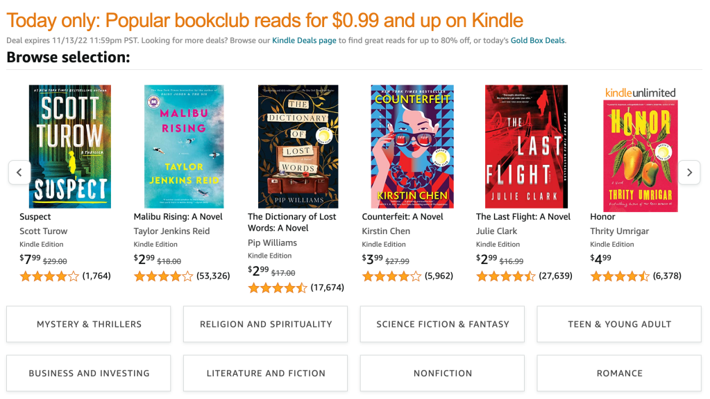 Check out today’s Kindle Daily Deals page, as one of the featured categories is Popular Book Club Reads. Over 150 titles are offered for prices ranging from $0.99 to $2.99, including my favorite: The Dictionary of Lost Words by Pip Williams.