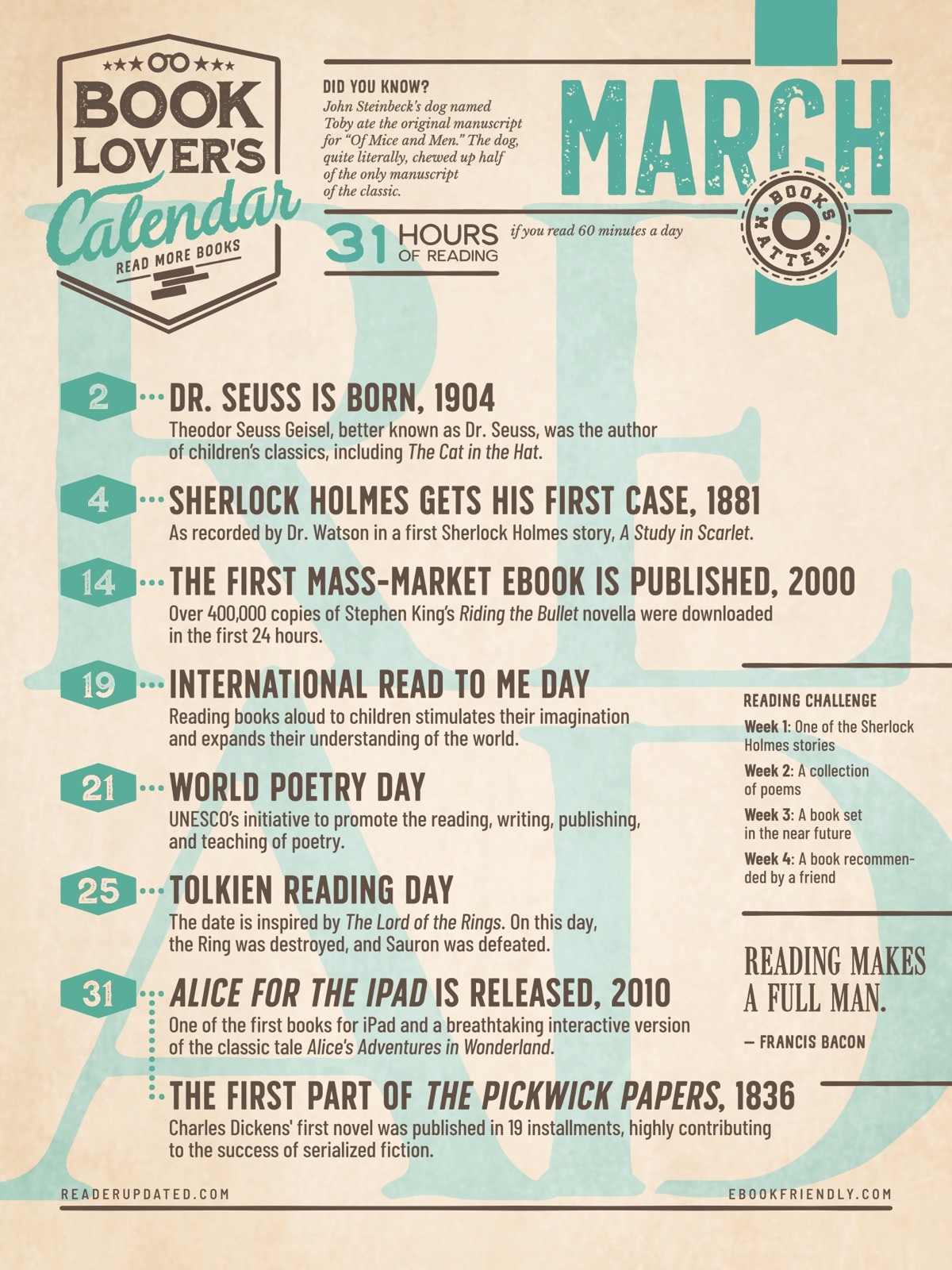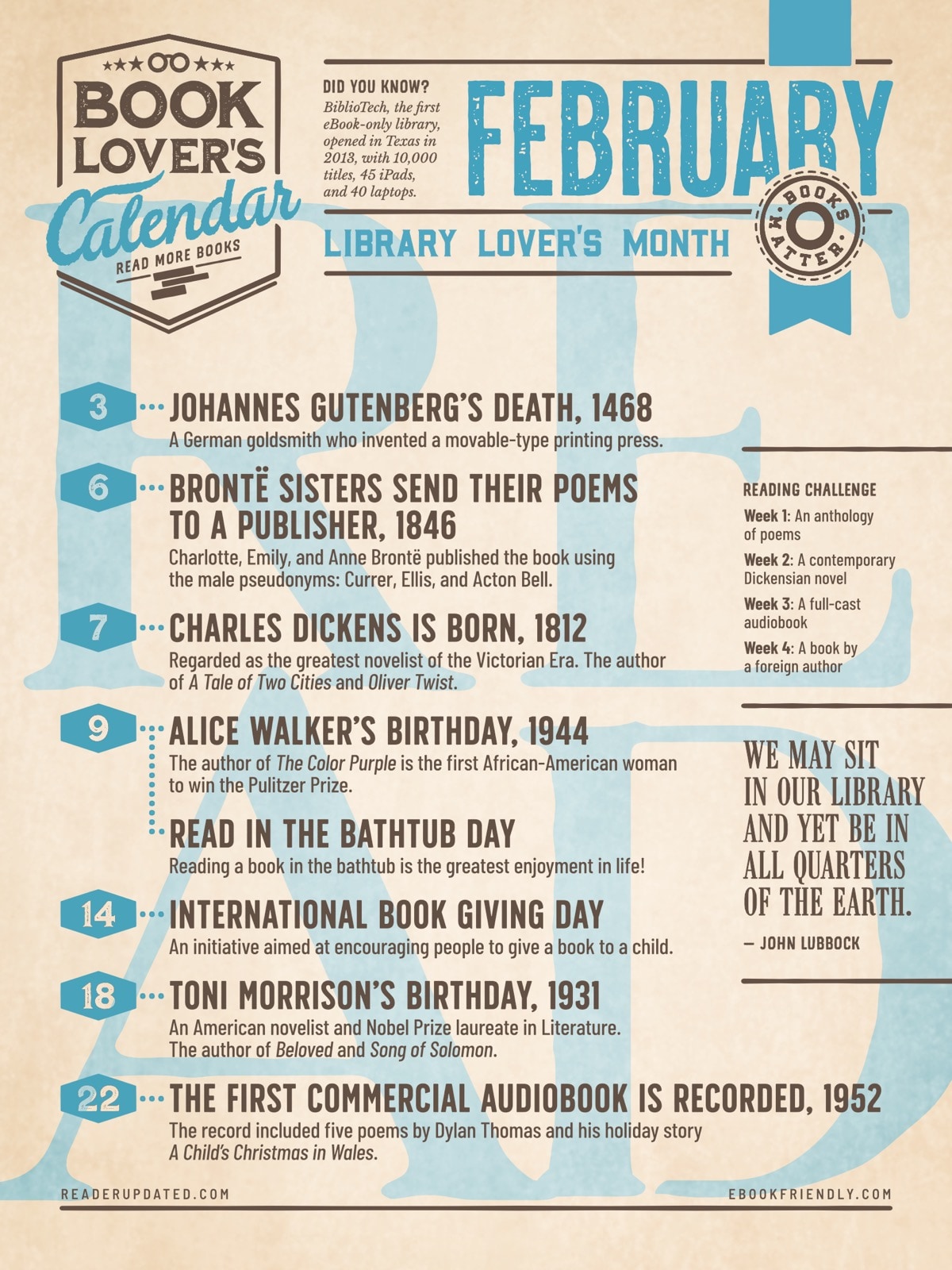 Apart from the dates, each calendar includes a reading challenge for 4 weeks, a quote about the importance of books and reading, a fun fact about books, reading, or libraries, and a total time you’d spend reading books, if you read … minutes per day.