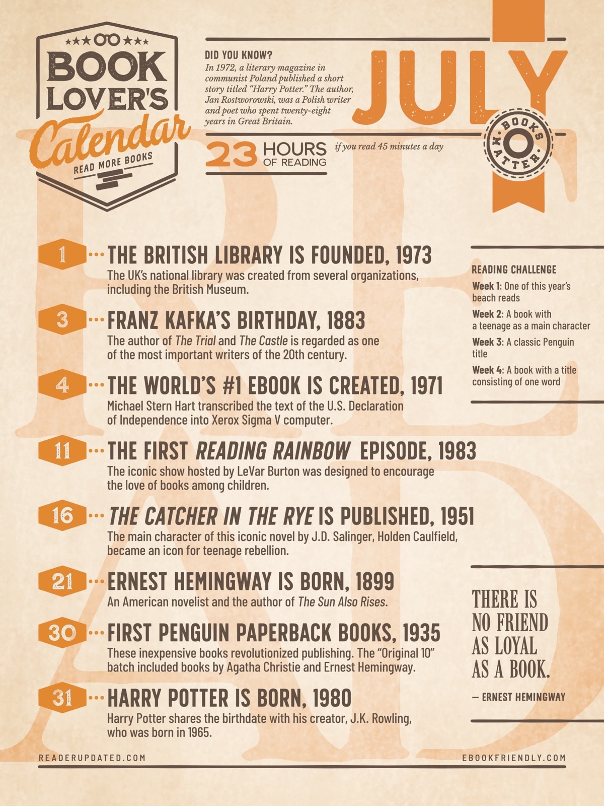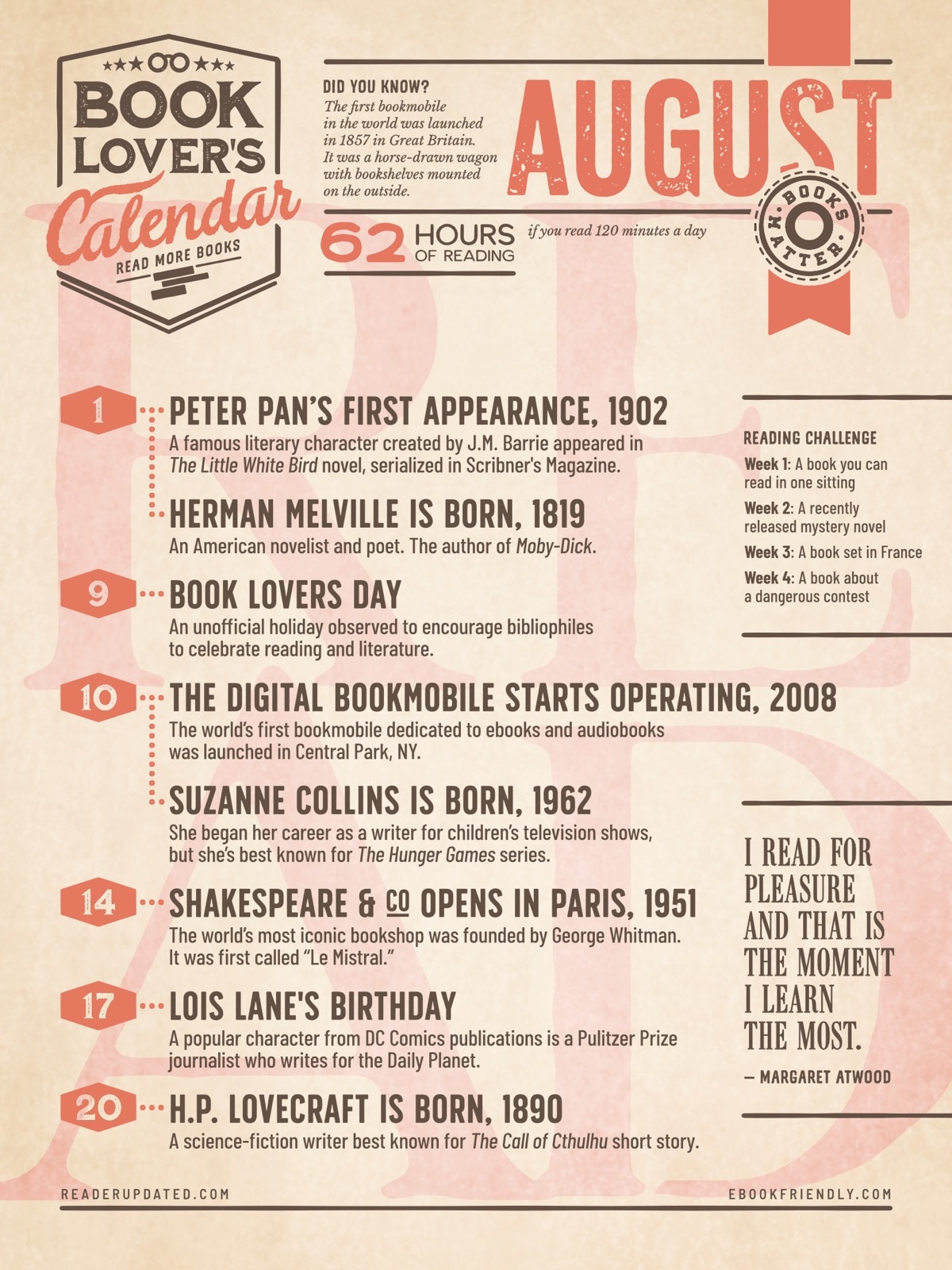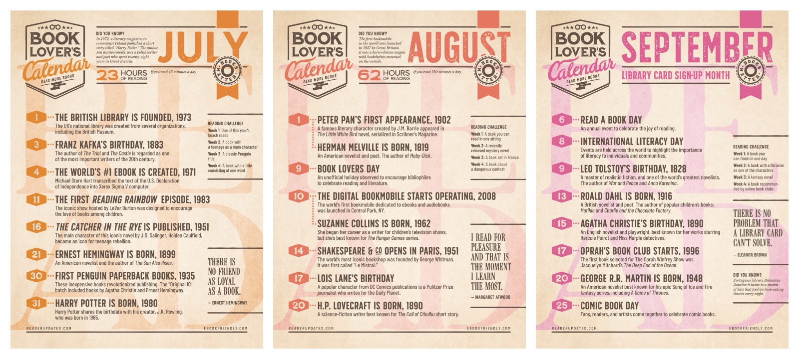 Apart from the dates, each calendar includes a reading challenge for 4 weeks, a quote about the importance of books and reading, a fun fact about books, reading, or libraries, and a total time you’d spend reading books, if you read … minutes per day.