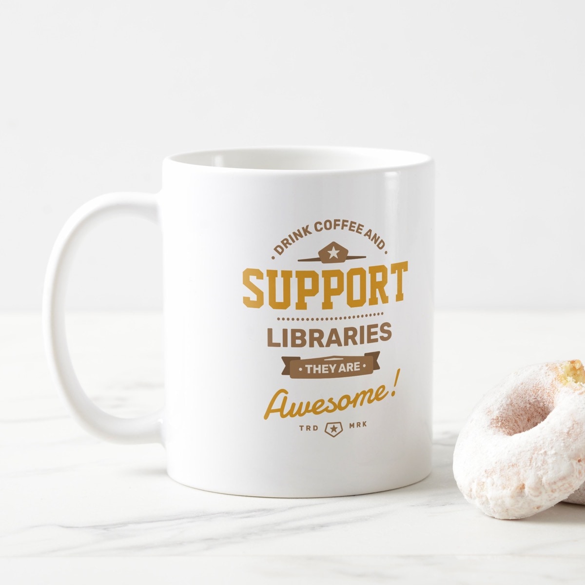 This modern, college-style artwork says: “Drink coffee and support libraries. They are awesome!”. You can type your text in as many as five areas. Just use the “Personalize” button to start typing.
