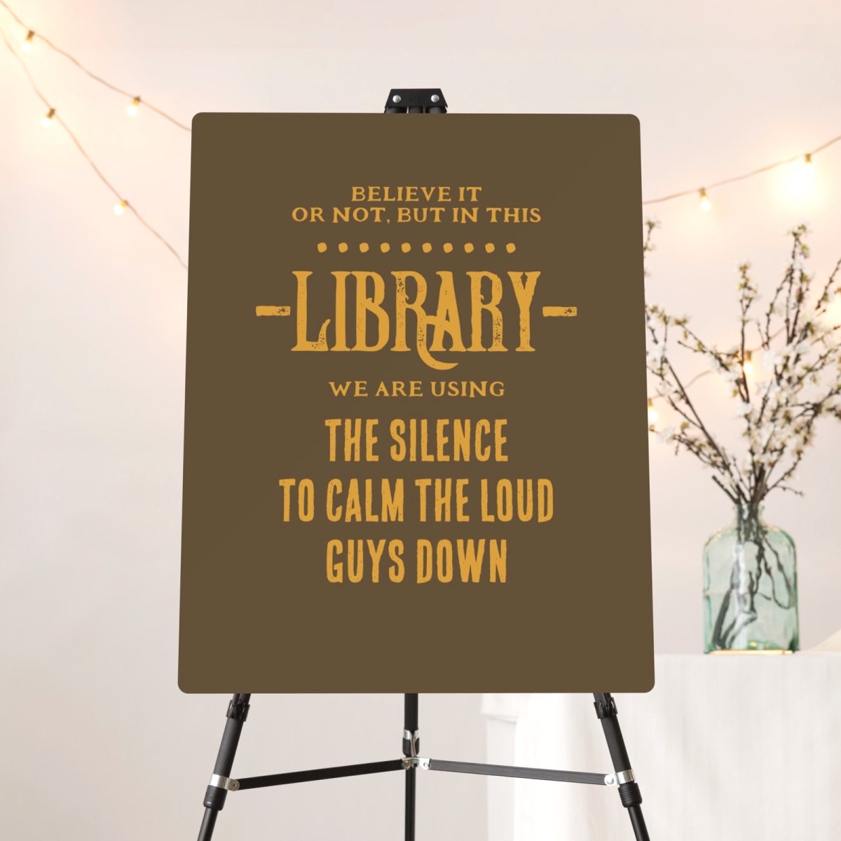 Are you a fan of a vintage typography? Check out this artwork that sports the 19th century display font and says: “Believe it or not, but in this library, we are using the silence to calm the loud guys down”.