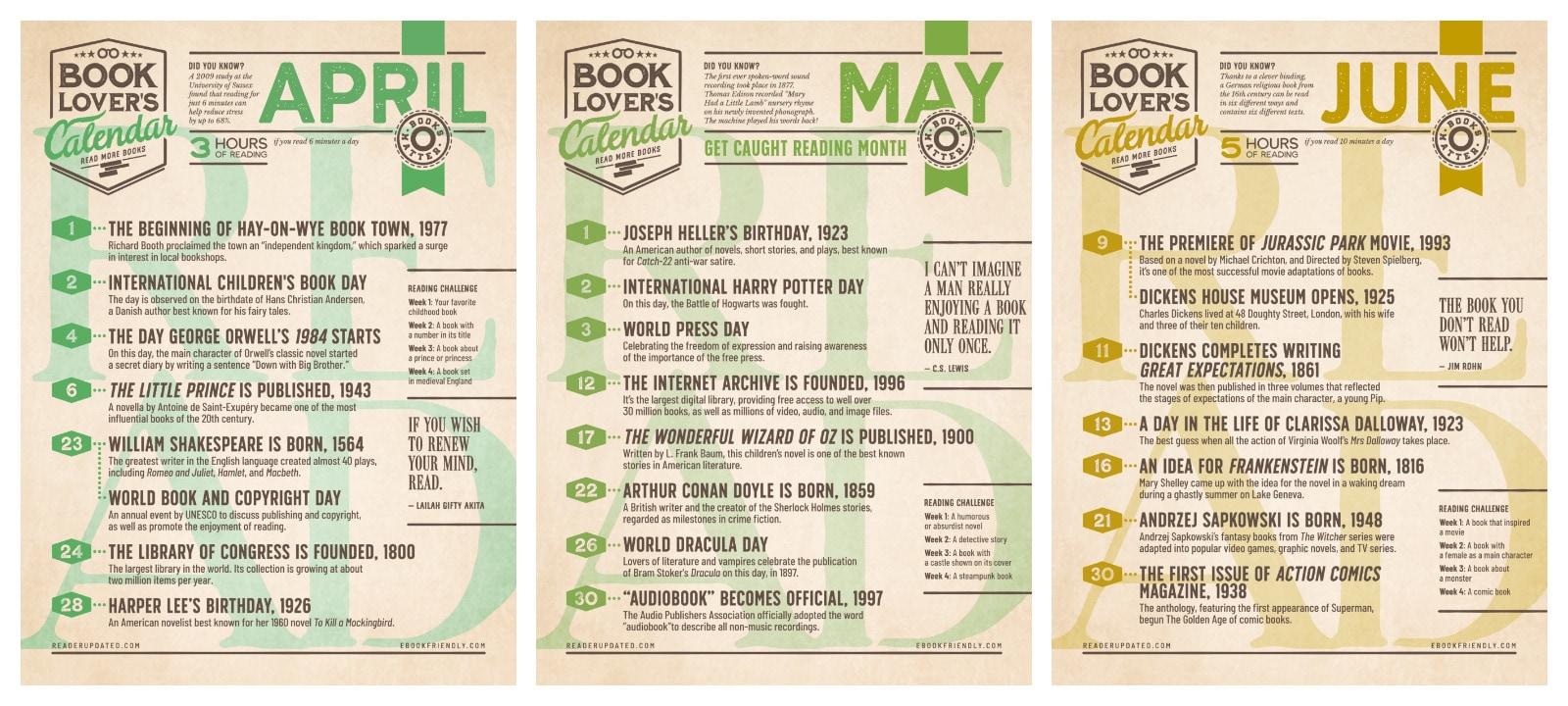Printable Book Lover’s Calendars for April, May, and June / Source: Ebook Friendly