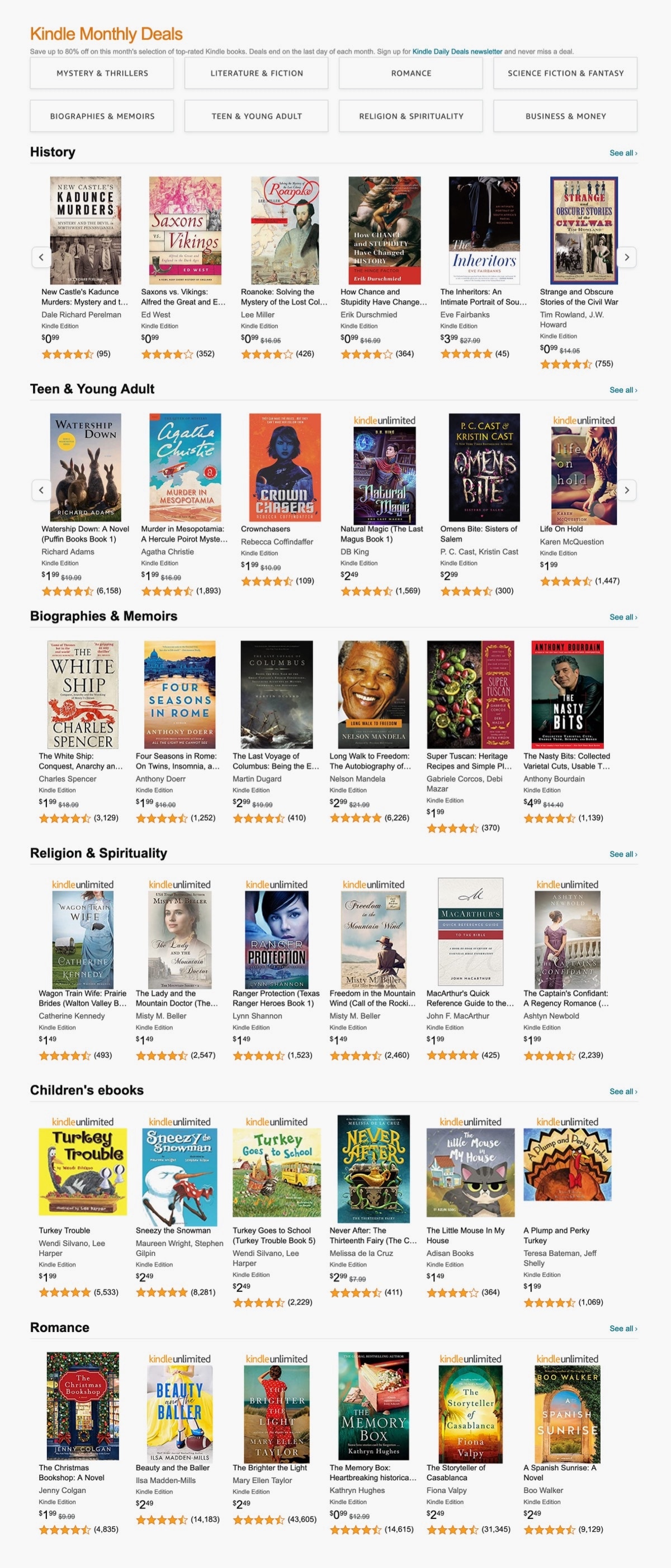 💬 Every month, the Kindle Monthly Deals page helps you discover great deals in our rotating selection of Kindle books. Here you’ll find current best selling deals, newly released deals, and so much more.