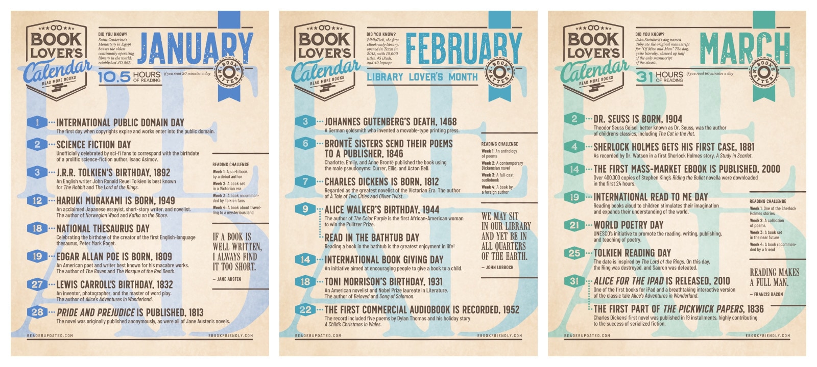 Printable Book Lover’s Calendars for January, February, and March / Source: Ebook Friendly